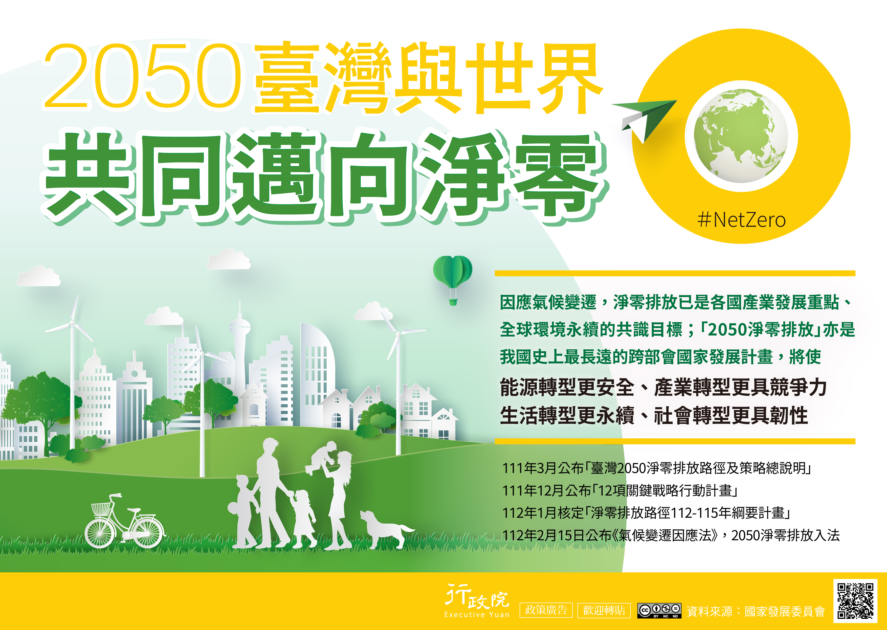 一、為呼應全球淨零排放之趨勢,政府陸續公布或核定我國2050淨零排放之路徑、策略及行動計畫,並將此目標納入《氣候變遷因應法》,展現我國邁向淨零之決心。行政院特策製旨揭說明資料,請協助推廣運用,電子檔請至本院全球資訊網「政策與計畫─政策櫥窗」項下下載。