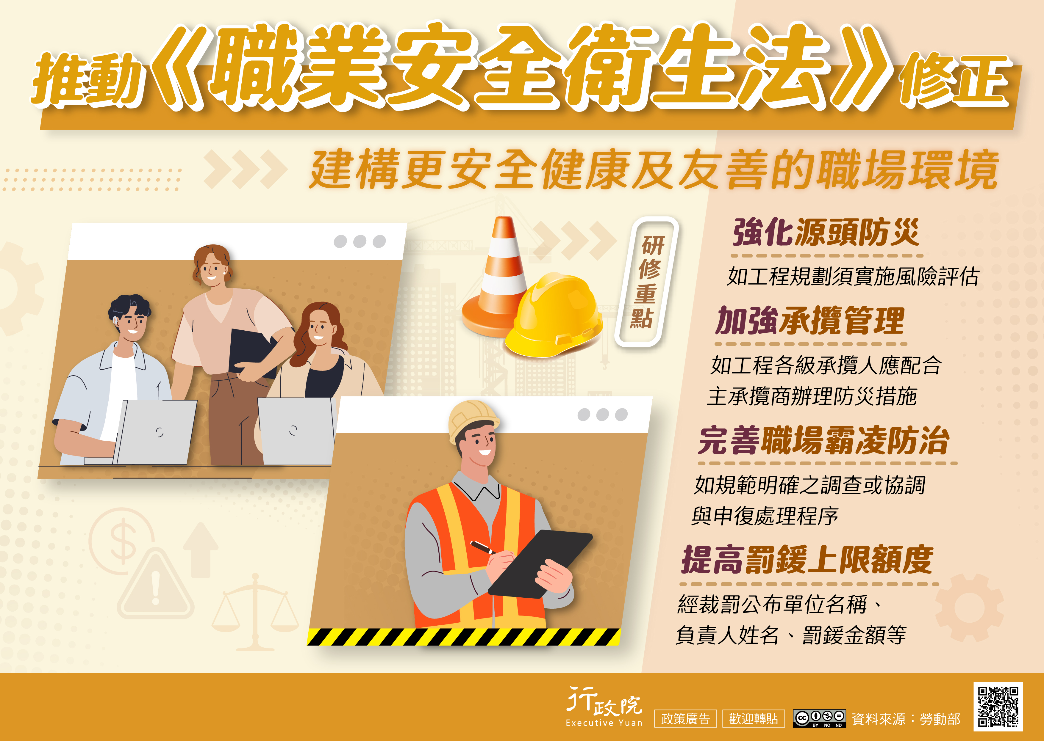 卓院長表示,《職業安全衛生法》是保障勞工安全健康的主要法律,因應國際發展趨勢及國內生產產業現況,勞動部積極朝強化源頭防災、加強承攬管理、完善職場霸凌防治、提高罰鍰上限額度等方向進行調整,藉此可進一步督促事業單位落實職場防災責任、建構更友善的職場環境。