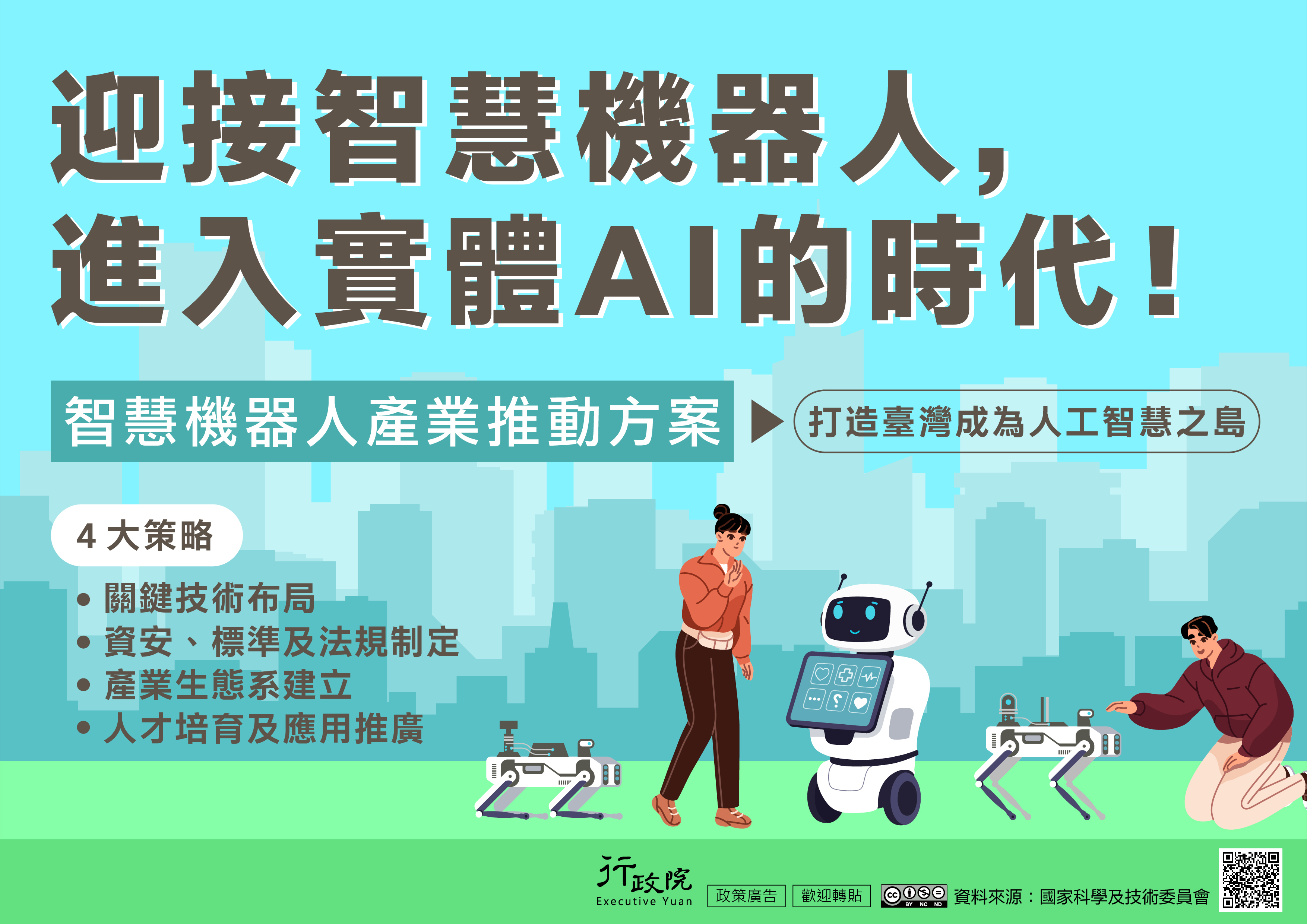 卓院長表示,「AI新科技-智慧機器人計畫」透過布局關鍵技術、建立產業生態系、完善資安法規、以及人才培育與推廣4項策略,跨部會合作,整合我國產學研的研發能量。卓院長請相關部會共同積極合作推動,以實現技術自主、系統創新、產值提升,及社會普及的智慧機器人產業發展願景,打造我國成為人工智慧之島。