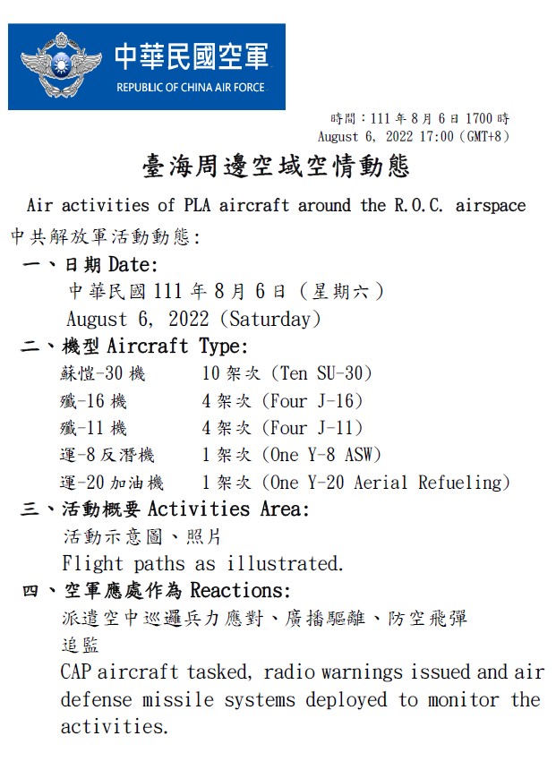 國防部今(6)日表示,迄1700時止,偵獲共機20架次、共艦14艘次,持續在臺海周邊活動,進行海空聯合演習。國軍嚴密監控敵情,除廣播驅離,並運用空中偵巡兵力、海軍艦艇,以及岸置飛彈應處。