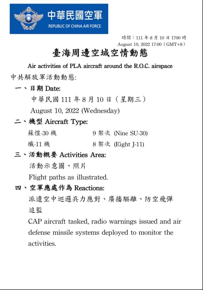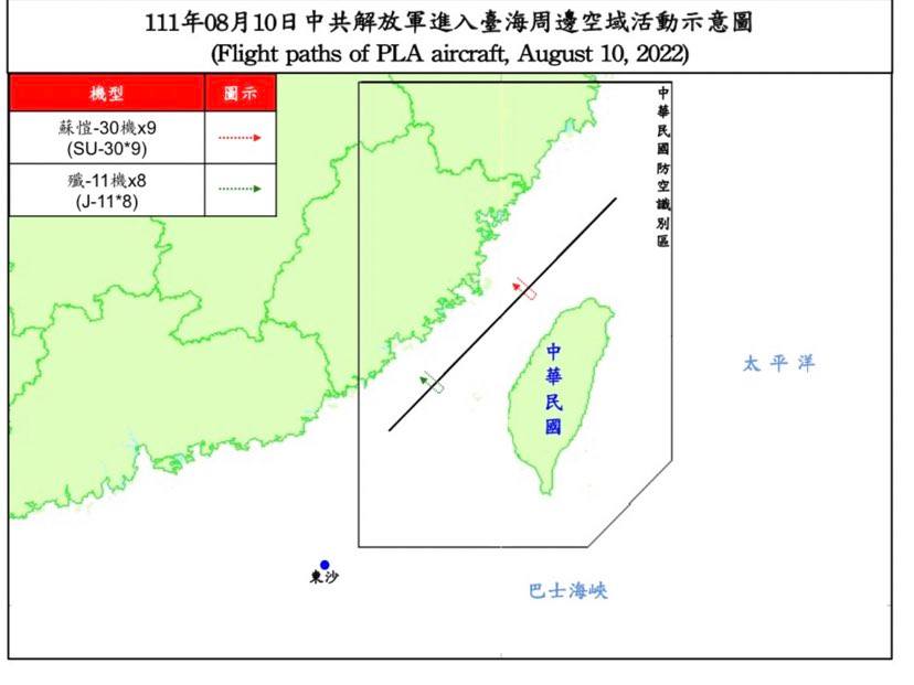 國防部今(10)日表示,迄1700時止,計偵獲共機 36架次(其中逾越海峽中線17架次)、共艦10艘次,在臺海周邊活動,進行聯合海空行動。