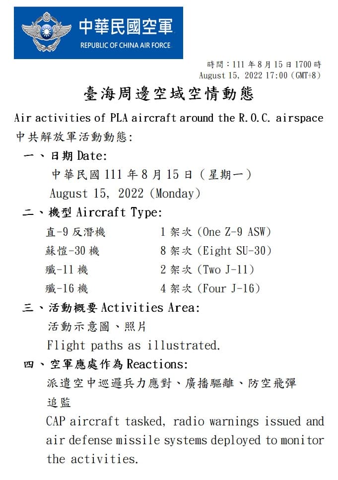 針對中共東部戰區宣布,將於臺灣周邊海空域,組織多軍兵種聯合戰備警巡,國防部表示,迄1700時止,偵獲共機30架次(其中逾越海峽中線15架次)、共艦5艘次,持續在臺海周邊活動。國軍運用任務機、艦及岸置飛彈系統嚴密監控與應處。 國防部指出,針對中共持續發布軍演訊息,破壞區域和平穩定,國防部除表達譴責;亦將全般掌握臺海周邊海、空域動態,秉持「處處皆戰場,時時做訓練」的觀念,把握機會驗證平時訓練成果,沉著、冷靜、嚴肅面對,捍衛國家安全。
