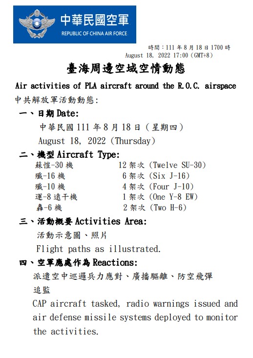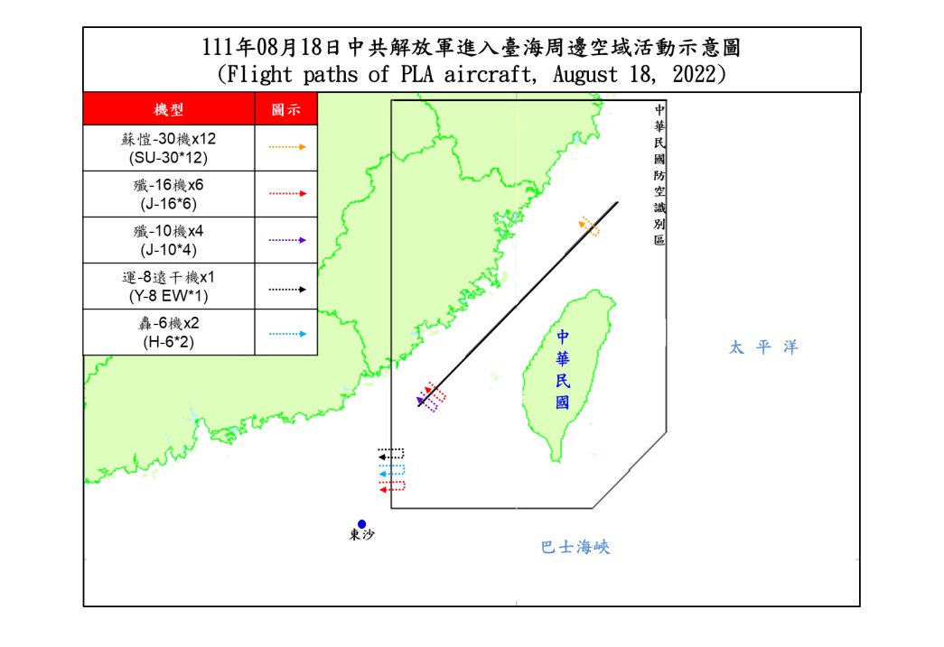 國防部今(18)日表示,迄1700時止,偵獲共機51架次(其中逾越海峽中線及其延伸線進入西南空域25架次)、共艦6艘次,持續於臺灣周邊海空域活動。國軍運用任務機、艦及岸置飛彈系統嚴密監控與應處。