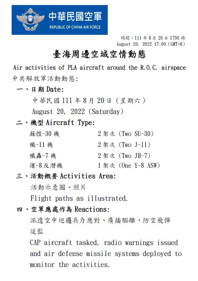 國防部今(20)日表示,迄1700時止,偵獲共機17架次(其中逾越海峽中線及其延伸線進入西南空域7架次)、共艦5艘次,持續於臺灣周邊海空域活動。國軍運用任務機、艦及岸置飛彈系統嚴密監控與應處。