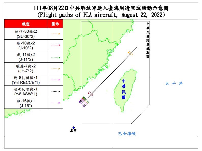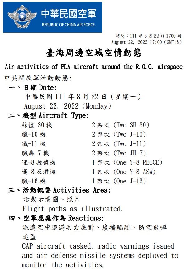 國防部今(22)日表示,迄1700時止,偵獲共機15架次(其中逾越海峽中線及其延伸線進入西南空域11架次)、共艦5艘次,持續於臺灣周邊海空域活動。國軍運用任務機、艦及岸置飛彈系統嚴密監控與應處。