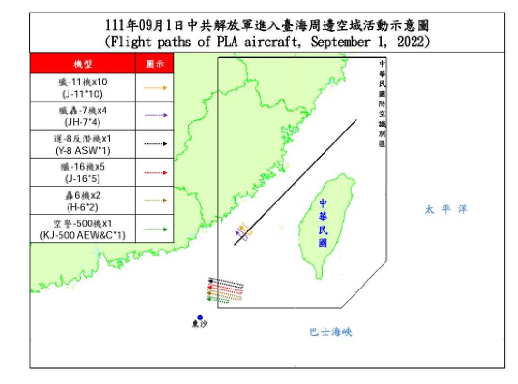 國防部今(1)日表示,迄1700時止,偵獲共機53架次(其中逾越海峽中線及其延伸線進入西南空域23架次)、共艦8艘次,持續於臺灣周邊海空域活動。國軍運用任務機、艦及岸置飛彈系統嚴密監控與應處。