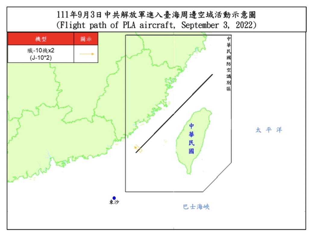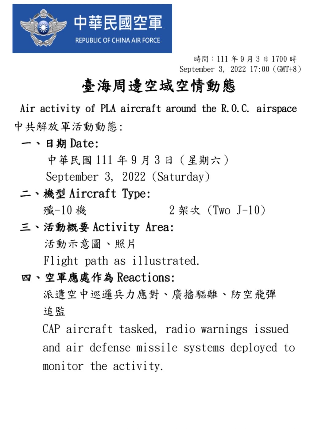 國防部今(3)日表示,迄1700時止,偵獲共機4架次(其中逾越海峽中線2架次)、共艦5艘次,持續於臺灣周邊海空域活動。國軍運用任務機、艦及岸置飛彈系統嚴密監控與應處。
