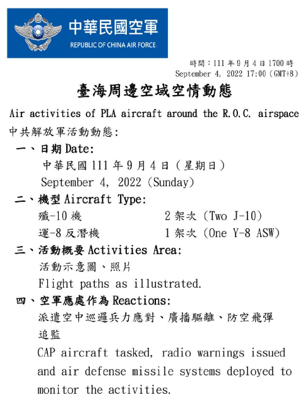 國防部今(4)日表示,迄1700時止,偵獲共機7架次(逾越海峽中線及其延伸線進入西南空域3架次)、無人機1架次、共艦5艘次,持續於臺灣周邊海空域活動。國軍運用任務機、艦及岸置飛彈系統嚴密監控與應處。