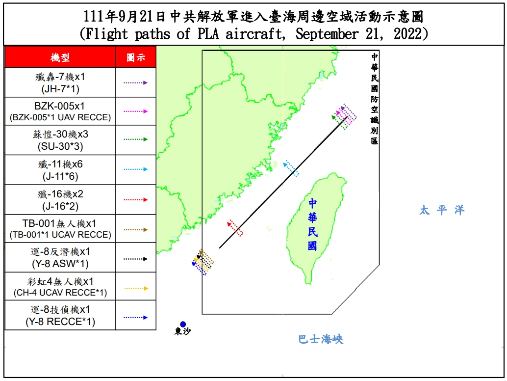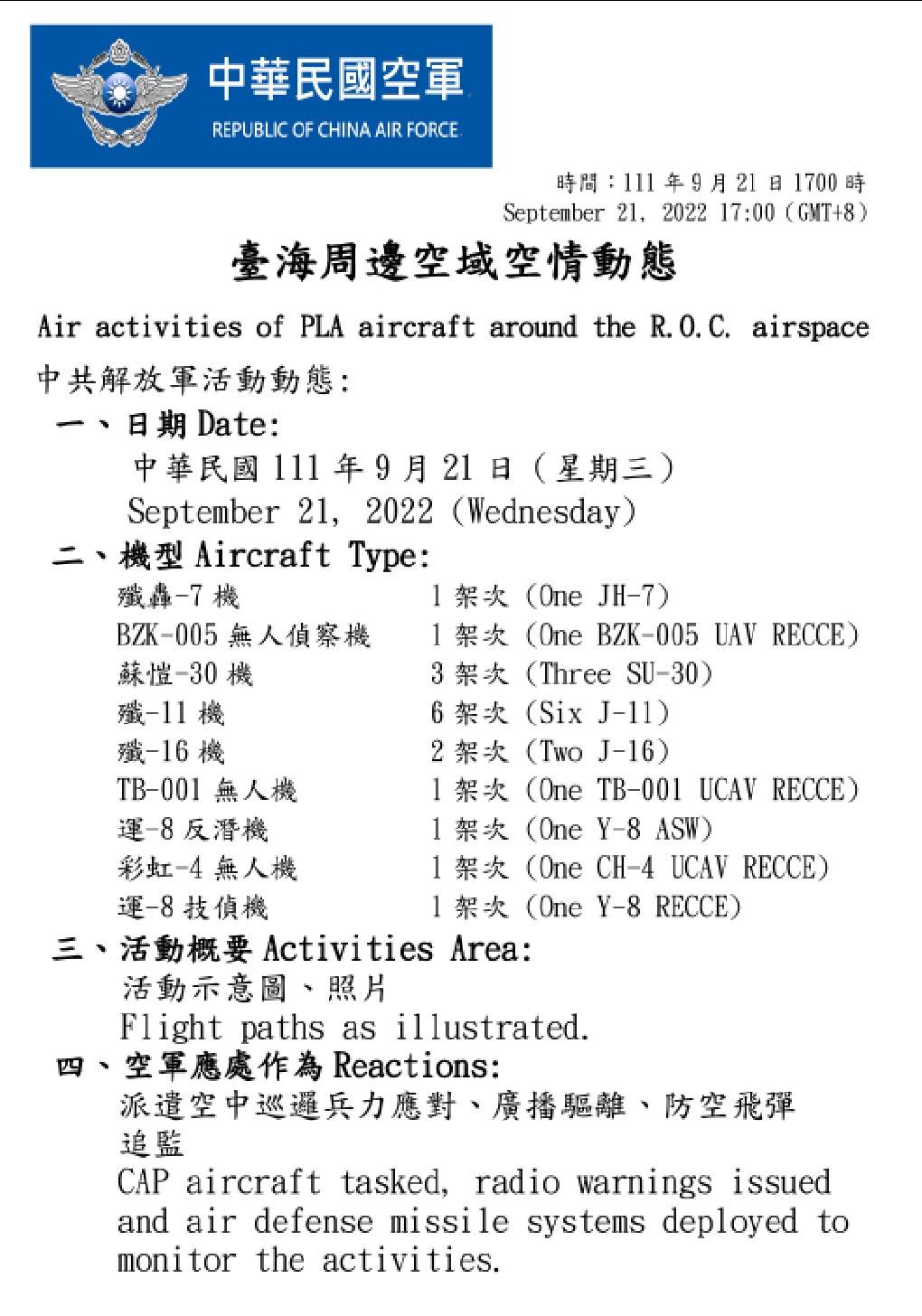 國防部今(21)日表示,迄1700時止,偵獲共機38架次(逾越海峽中線及其延伸線進入西南空域17架次)、共艦6艘次,持續於臺灣周邊海空域活動。國軍運用任務機、艦及岸置飛彈系統嚴密監控與應處。