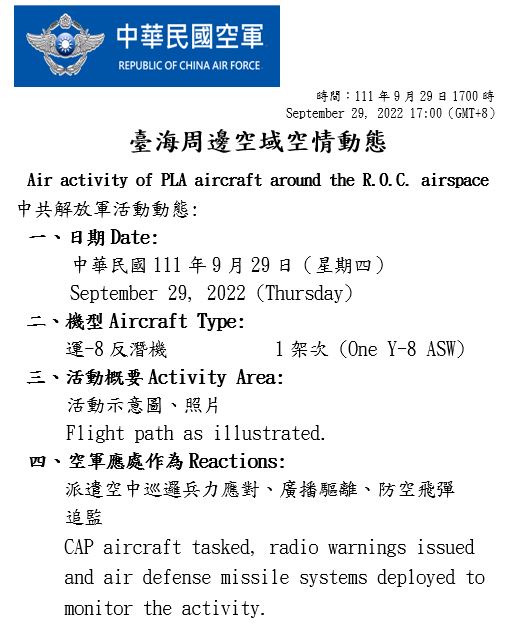 國防部今(29)日表示,迄1700時止,偵獲共機11架次(其中進入西南空域1架次)共艦4艘次,持續於臺灣周邊海空域活動。國軍運用任務機、艦及岸置飛彈系統嚴密監控與應處。