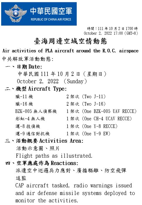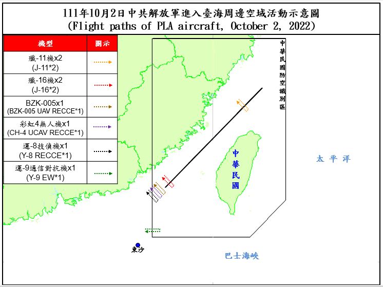 國防部今(2)日表示,迄1700時止,偵獲共機22架次(逾越海峽中線及其延伸線進入西南空域8架次)、共艦4艘次,持續於臺灣周邊海空域活動。國軍運用任務機、艦及岸置飛彈系統嚴密監控與應處。