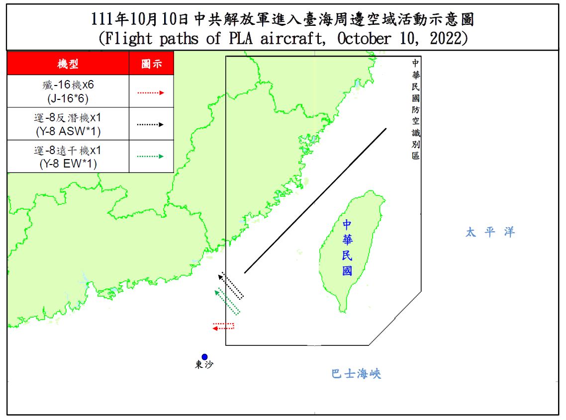 國防部今(10)日表示,迄1700時止,偵獲共機26架次(其中進入西南空域8架次)、共艦4艘次,持續於臺灣周邊海空域活動。國軍運用任務機、艦及岸置飛彈系統嚴密監控與應處。