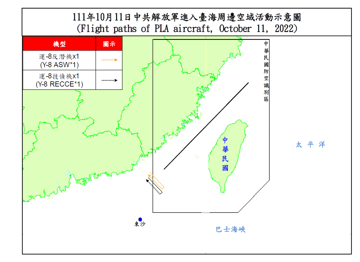 國防部今(11)日表示,迄1700時止,偵獲共機11架次(其中進入西南空域2架次)、共艦4艘次,持續於臺灣周邊海空域活動。國軍運用任務機、艦及岸置飛彈系統嚴密監控與應處。