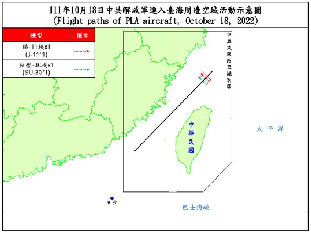 國防部今(18)日表示,迄1700時止,偵獲共機11架次(逾越海峽中線2 架次)、共艦2艘次,持續於臺灣周邊海空域活動。國軍運用任務機、艦及岸置飛彈系統嚴密監控與應處。