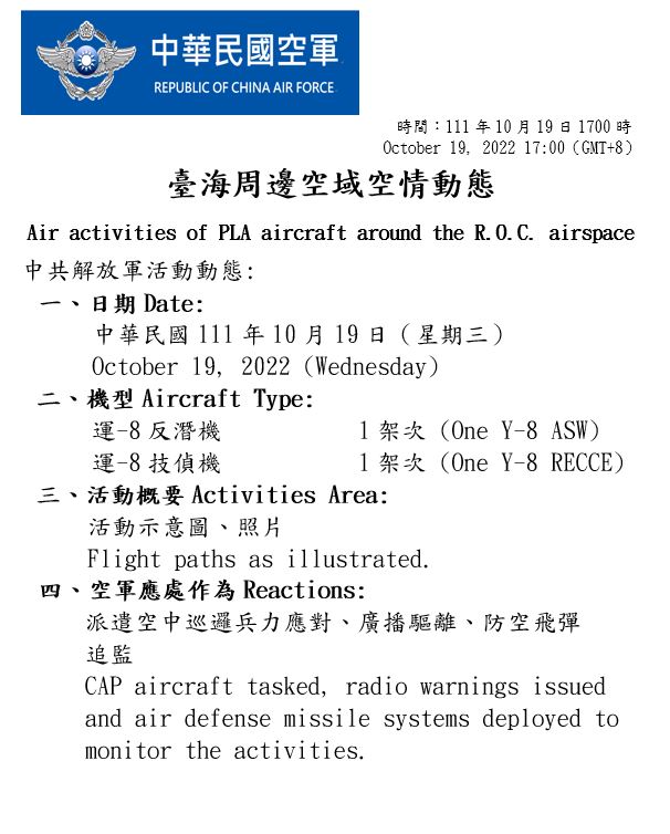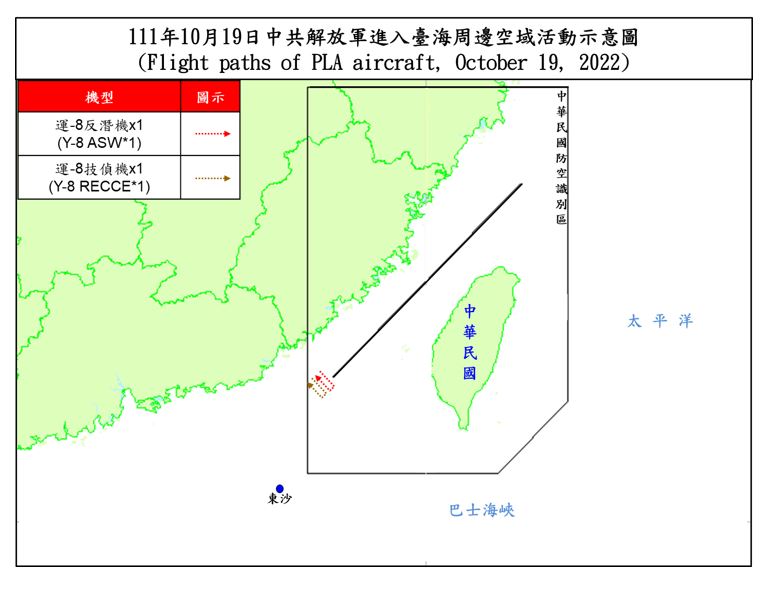 國防部今(19)日表示,迄1700時止,偵獲共機11架次(其中進入西南空域2架次)、共艦2艘次,持續於臺灣周邊海空域活動。國軍運用任務機、艦及岸置飛彈系統嚴密監控與應處。