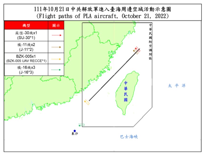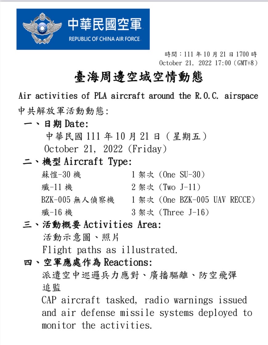 國防部今(21)日表示,迄1700時止,偵獲共機22架次(逾越海峽中線及其延伸線進入西南空域7架次)、共艦3艘次,持續於臺灣周邊海空域活動。國軍運用任務機、艦及岸置飛彈系統嚴密監控與應處。