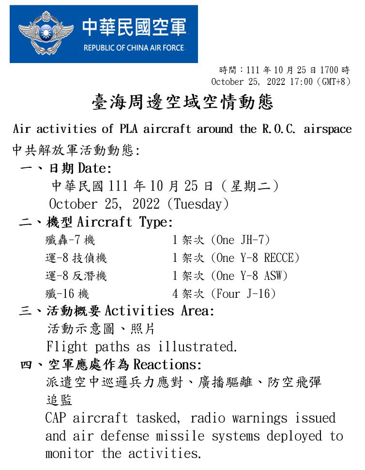 國防部今(25)日表示,迄1700時止,偵獲共機16架次(逾越海峽中線及其延伸線進入西南空域7架次)、共艦3艘次,持續於臺灣周邊海空域活動。國軍運用任務機、艦及岸置飛彈系統嚴密監控與應處。