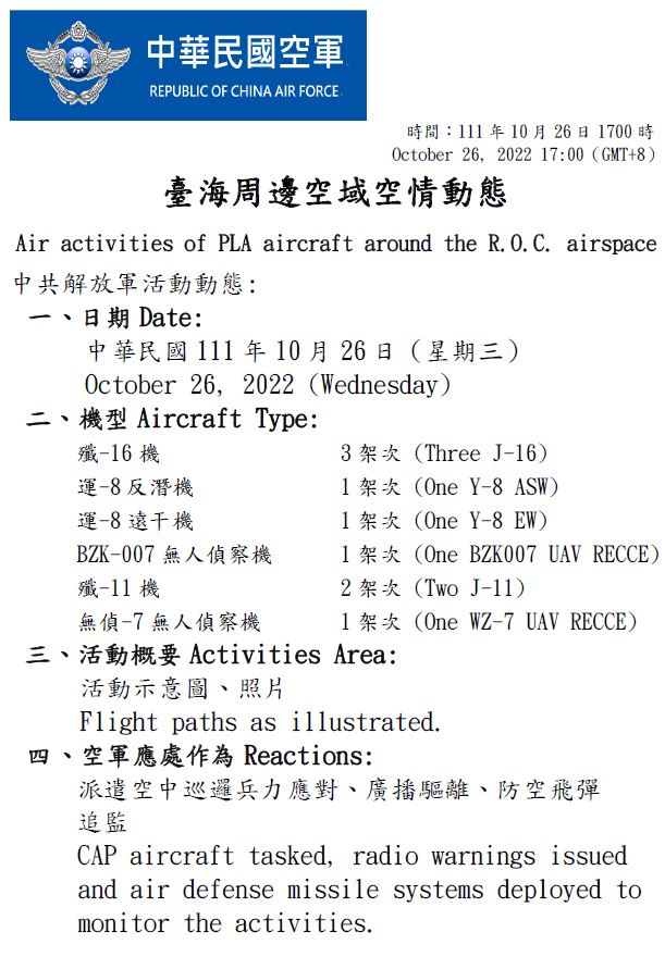 國防部今(26)日表示,迄1700時止,偵獲共機22架次(其中進入西南空域9架次)、共艦3艘次,持續於臺灣周邊海空域活動。國軍運用任務機、艦及岸置飛彈系統嚴密監控與應處。