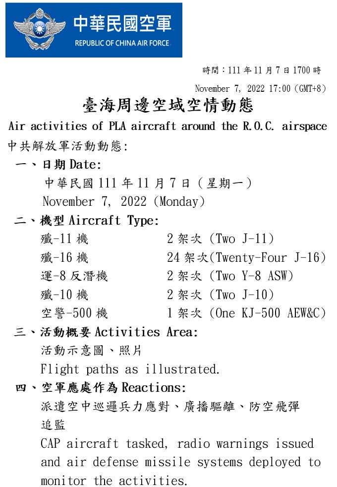 國防部今(7)日表示,迄1700時止,偵獲共機63架次(逾越海峽中線及其延伸線進入西南空域31架次)、共艦4艘次,持續於臺灣周邊海空域活動。國軍運用任務機、艦及岸置飛彈系統嚴密監控與應處。