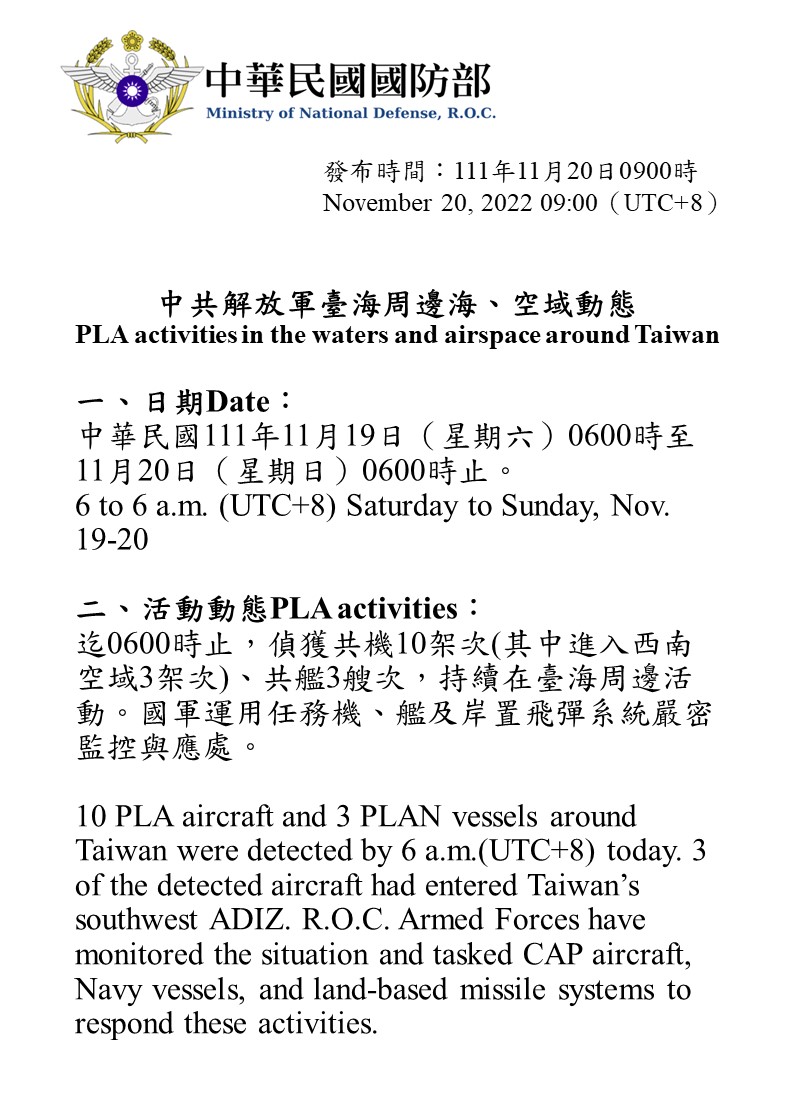 迄0600時止,偵獲共機10架次(其中進入西南空域3架次)、共艦3艘次,持續在臺海周邊活動。國軍運用任務機、艦及岸置飛彈系統嚴密監控與應處。