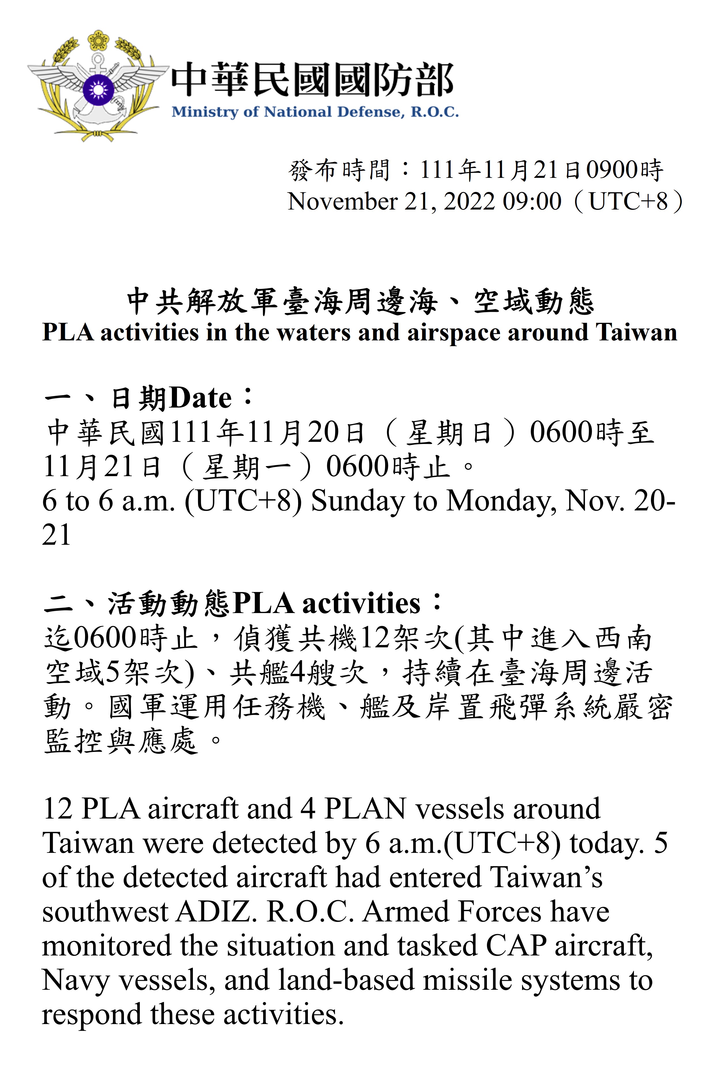 迄0600時止,偵獲共機12架次(其中進入西南空域5架次)、共艦4艘次,持續在臺海周邊活動。國軍運用任務機、艦及岸置飛彈系統嚴密監控與應處。