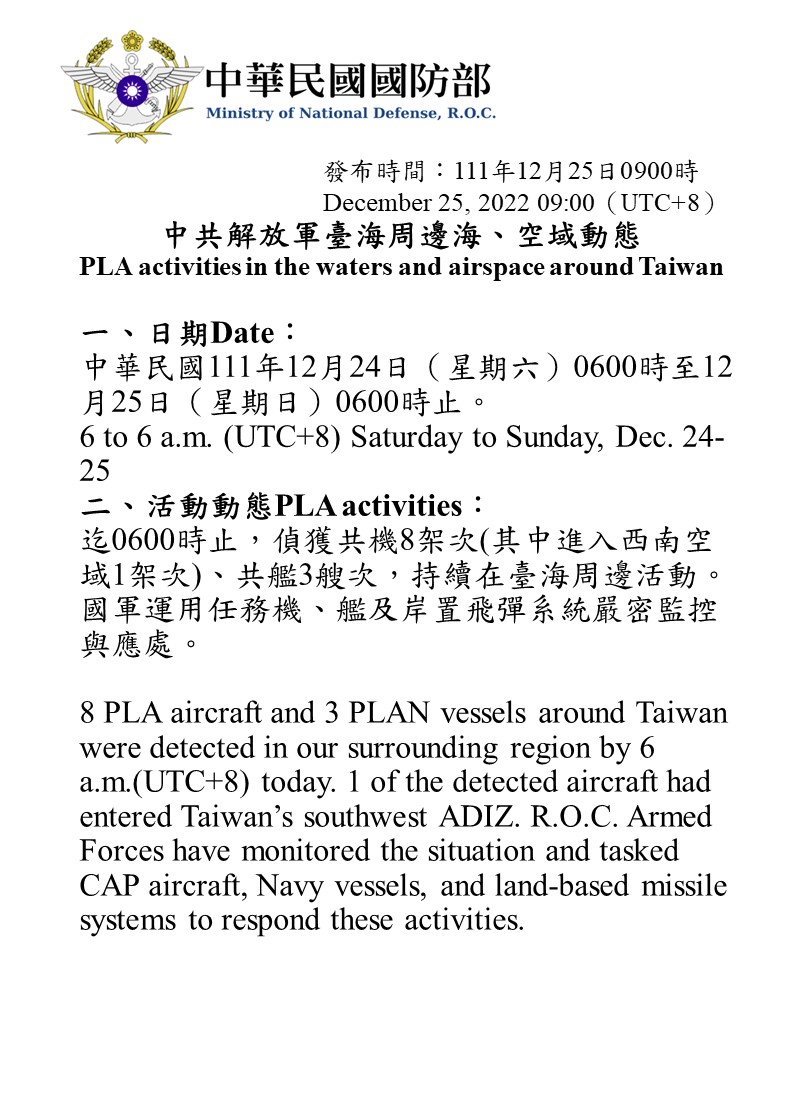 迄0600時止,偵獲共機8架次(其中進入西南空域1架次)、共艦3艘次,持續在臺海周邊活動。國軍運用任務機、艦及岸置飛彈系統嚴密監控與應處。