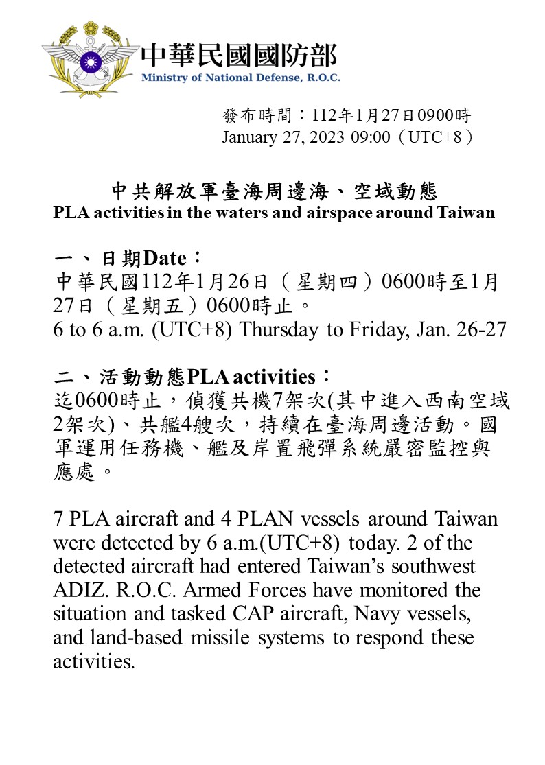 迄0600時止,偵獲共機7架次(其中進入西南空域2架次)、共艦4艘次,持續在臺海周邊活動。國軍運用任務機、艦及岸置飛彈系統嚴密監控與應處。