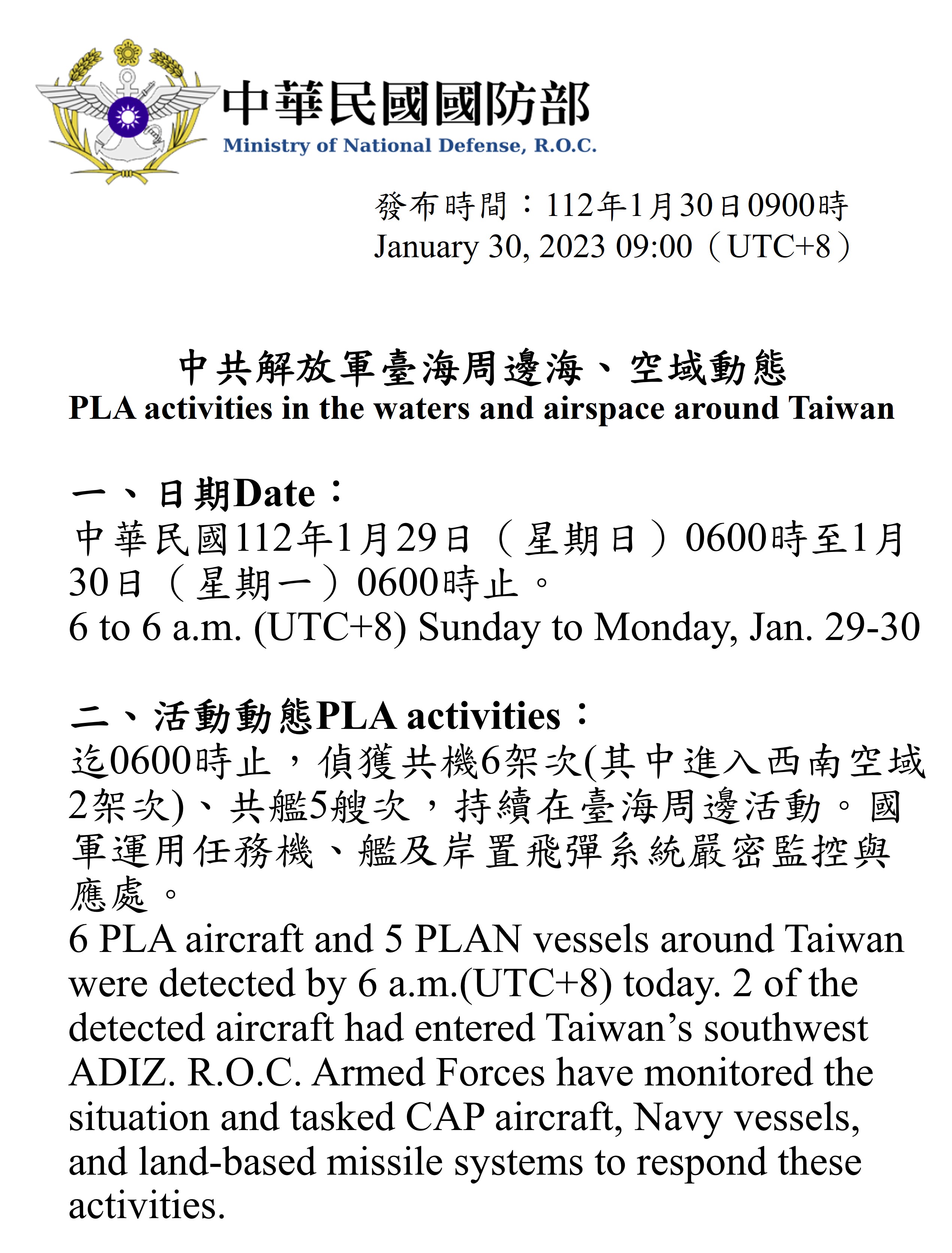 迄0600時止,偵獲共機6架次(其中進入西南空域2架次)、共艦5艘次,持續在臺海周邊活動。國軍運用任務機、艦及岸置飛彈系統嚴密監控與應處。