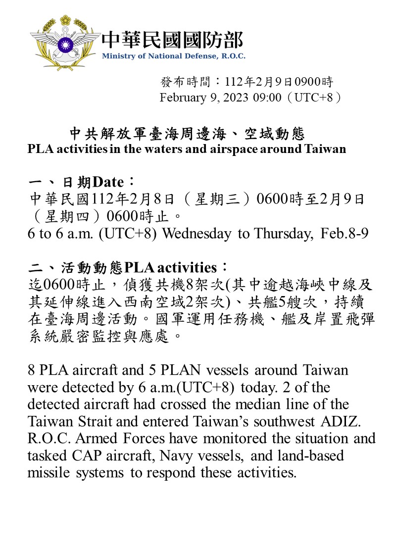迄0600時止,偵獲共機8架次(其中逾越海峽中線及其延伸線進入西南空域2架次)、共艦5艘次,持續在臺海周邊活動。國軍運用任務機、艦及岸置飛彈系統嚴密監控與應處。