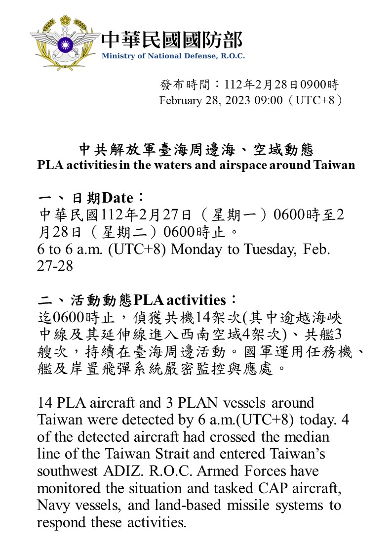 迄0600時止,偵獲共機14架次(其中逾越海峽中線及其延伸線進入西南空域4架次)、共艦3艘次,持續在臺海周邊活動。國軍運用任務機、艦及岸置飛彈系統嚴密監控與應處。