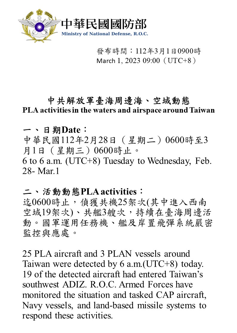 迄0600時止,偵獲共機25架次(其中進入西南空域19架次)、共艦3艘次,持續在臺海周邊活動。國軍運用任務機、艦及岸置飛彈系統嚴密監控與應處。