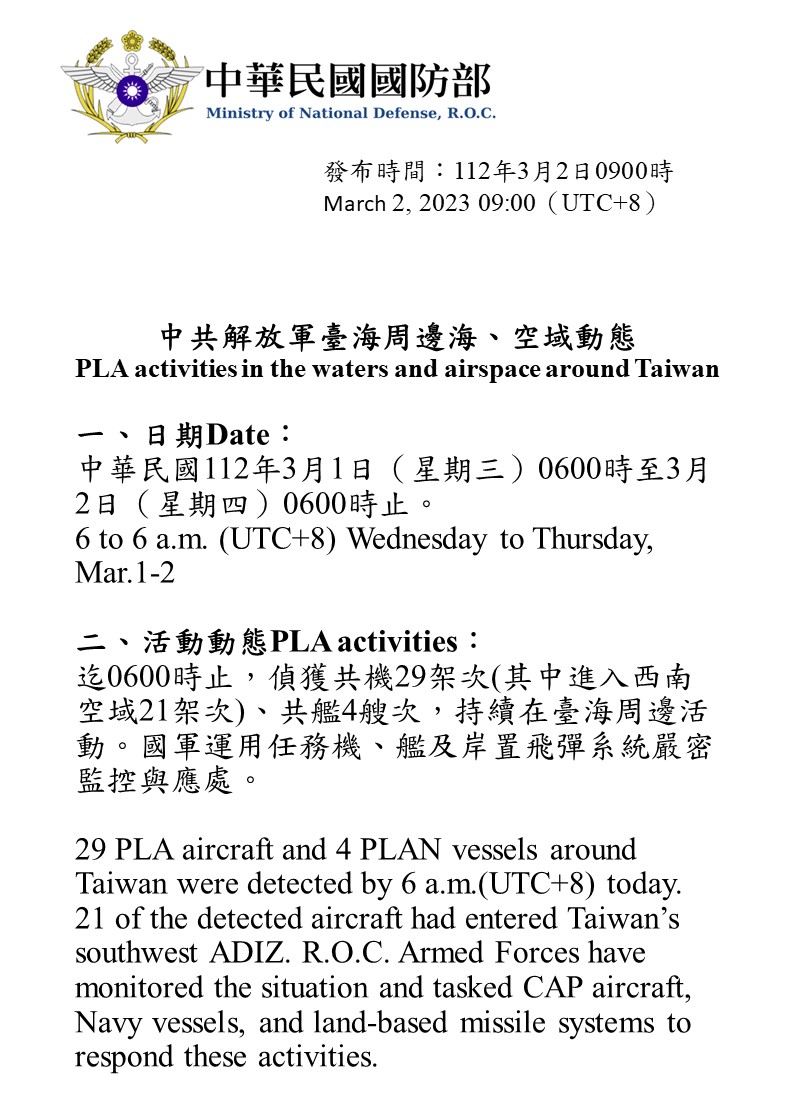 迄0600時止,偵獲共機29架次(其中進入西南空域21架次)、共艦4艘次,持續在臺海周邊活動。國軍運用任務機、艦及岸置飛彈系統嚴密監控與應處。