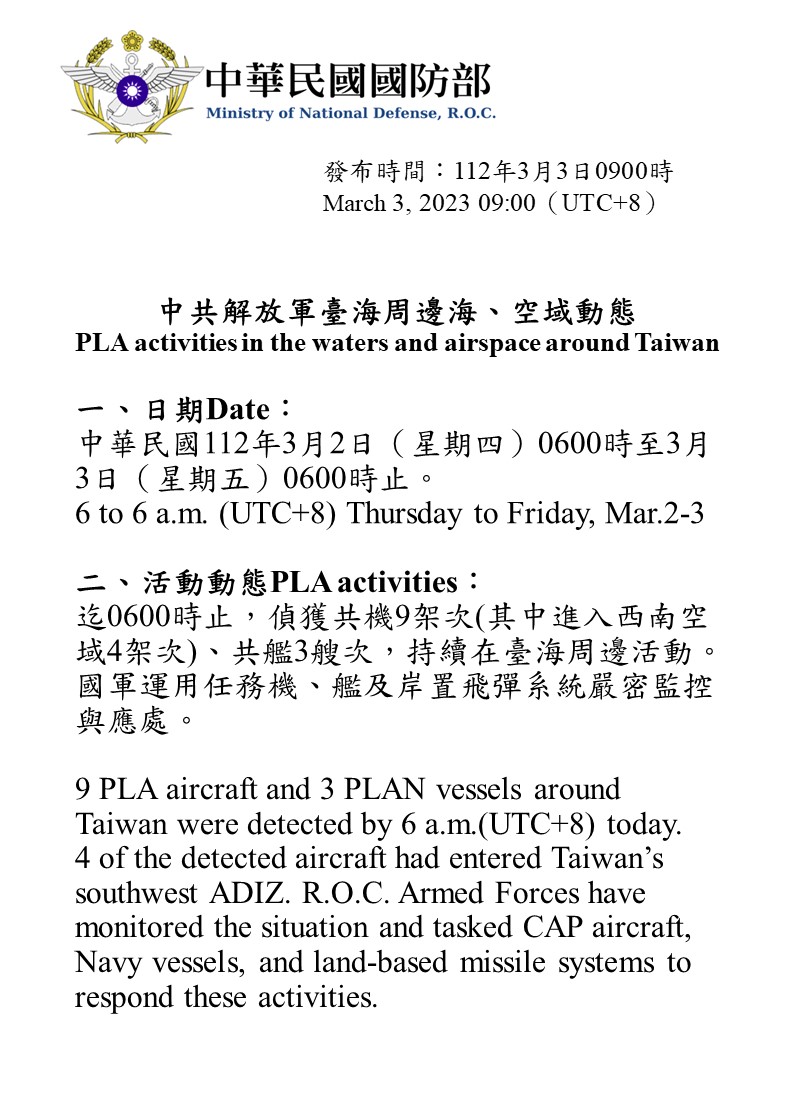 迄0600時止,偵獲共機9架次(其中進入西南空域4架次)、共艦3艘次,持續在臺海周邊活動。國軍運用任務機、艦及岸置飛彈系統嚴密監控與應處。