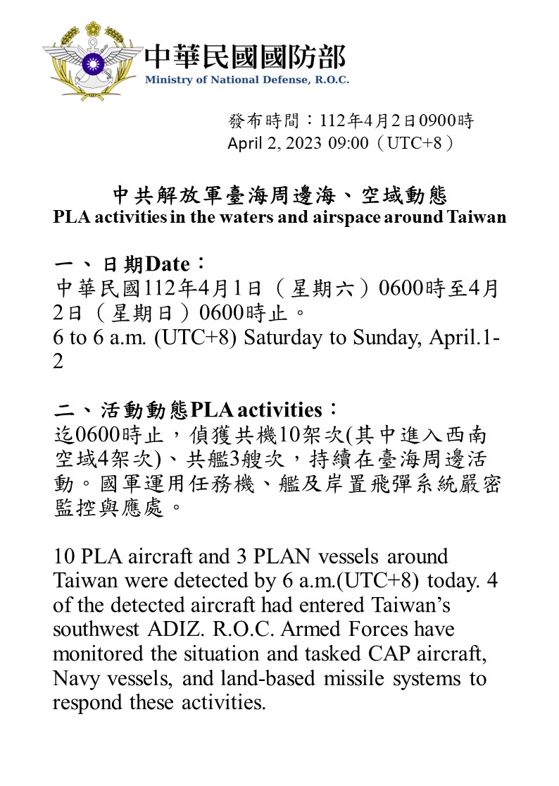 迄0600時止,偵獲共機10架次(其中進入西南空域4架次)、共艦3艘次,持續在臺海周邊活動。國軍運用任務機、艦及岸置飛彈系統嚴密監控與應處。