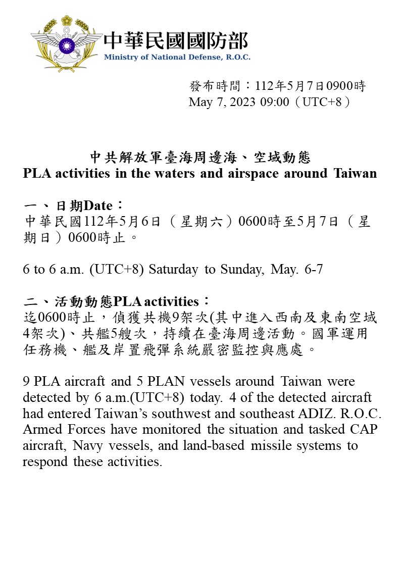 迄0600時止,偵獲共機9架次(其中進入西南及東南空域4架次)、共艦5艘次,持續在臺海周邊活動。國軍運用任務機、艦及岸置飛彈系統嚴密監控與應處。