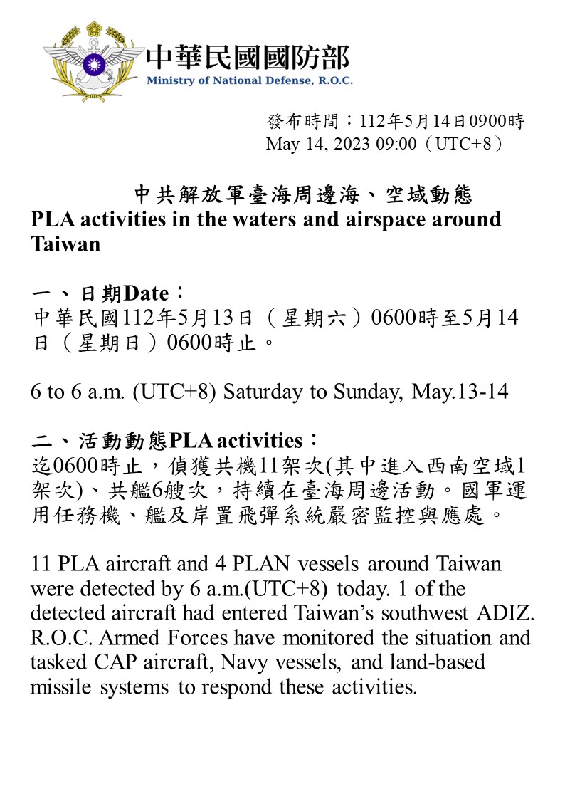 迄0600時止,偵獲共機11架次(其中進入西南空域1架次)、共艦6艘次,持續在臺海周邊活動。國軍運用任務機、艦及岸置飛彈系統嚴密監控與應處。