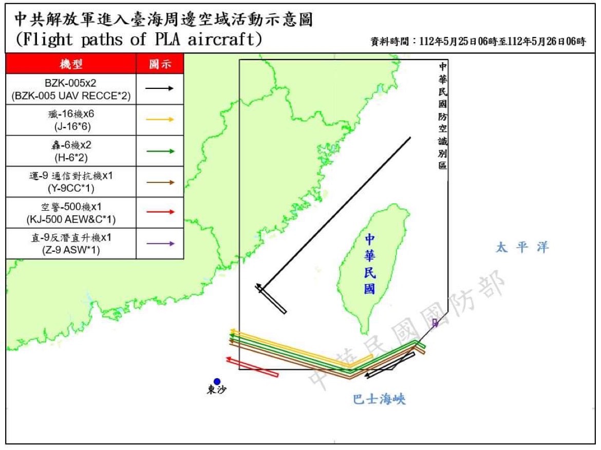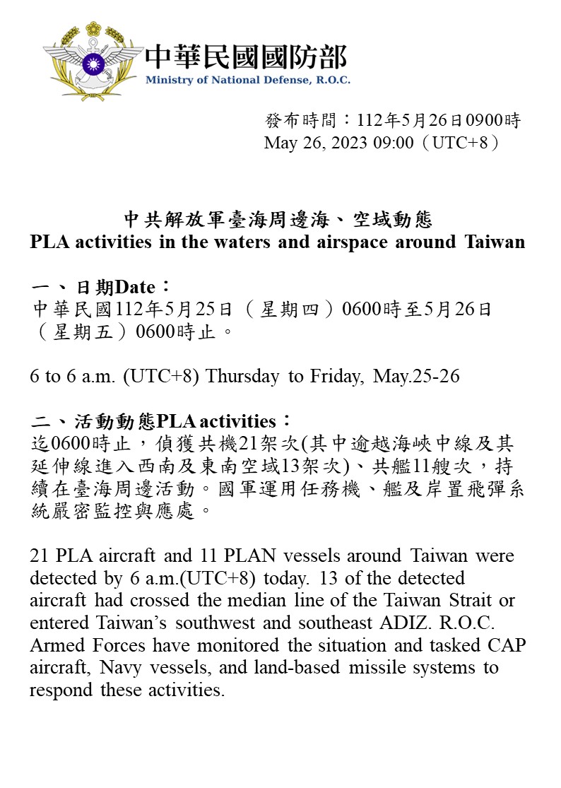 迄0600時止,偵獲共機21架次(其中逾越海峽中線及其延伸線進入西南及東南空域13架次)、共艦11艘次,持續在臺海周邊活動。國軍運用任務機、艦及岸置飛彈系統嚴密監控與應處。