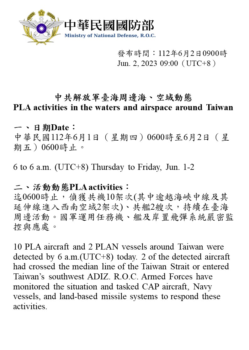 迄0600時止,偵獲共機10架次(其中逾越海峽中線及其延伸線進入西南空域2架次)、共艦2艘次,持續在臺海周邊活動。國軍運用任務機、艦及岸置飛彈系統嚴密監控與應處。