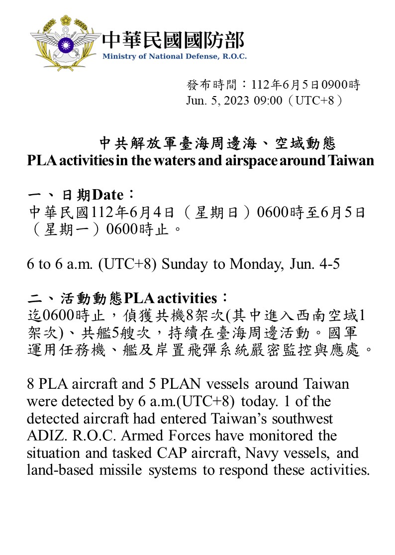 迄0600時止,偵獲共機8架次(其中進入西南空域1架次)、共艦5艘次,持續在臺海周邊活動。國軍運用任務機、艦及岸置飛彈系統嚴密監控與應處。