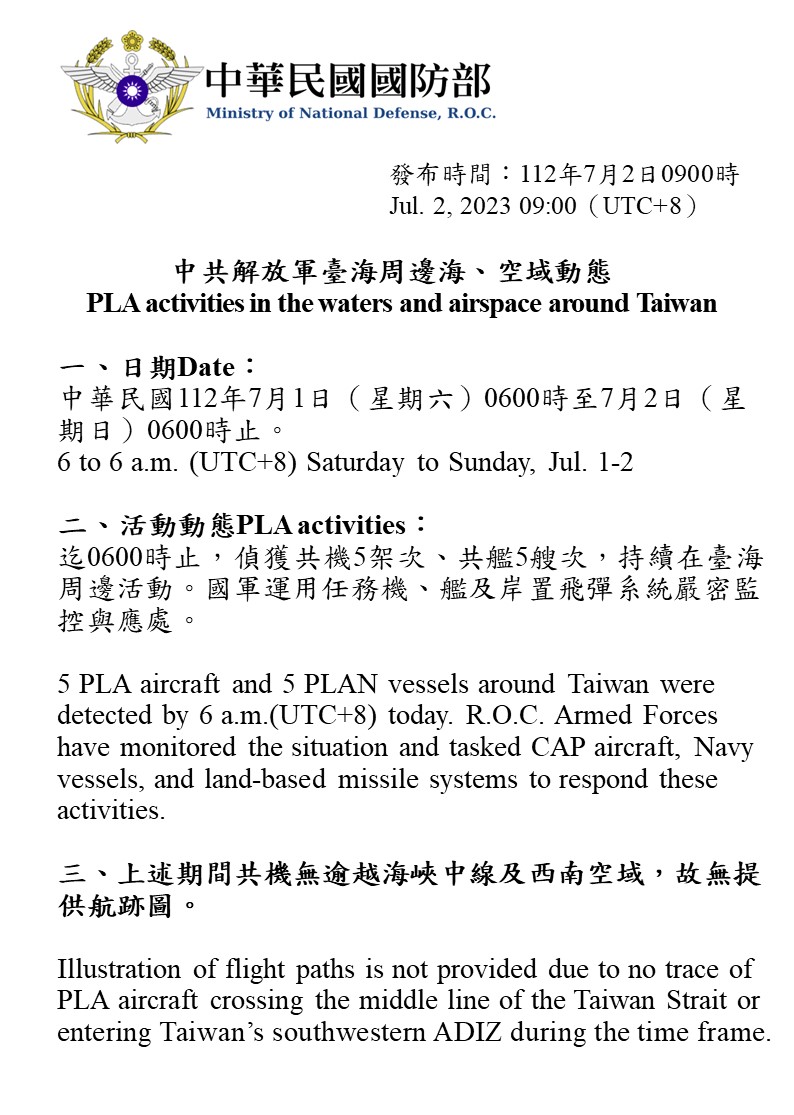 迄0600時止,偵獲共機5架次、共艦5艘次,持續在臺海周邊活動。國軍運用任務機、艦及岸置飛彈系統嚴密監控與應處。