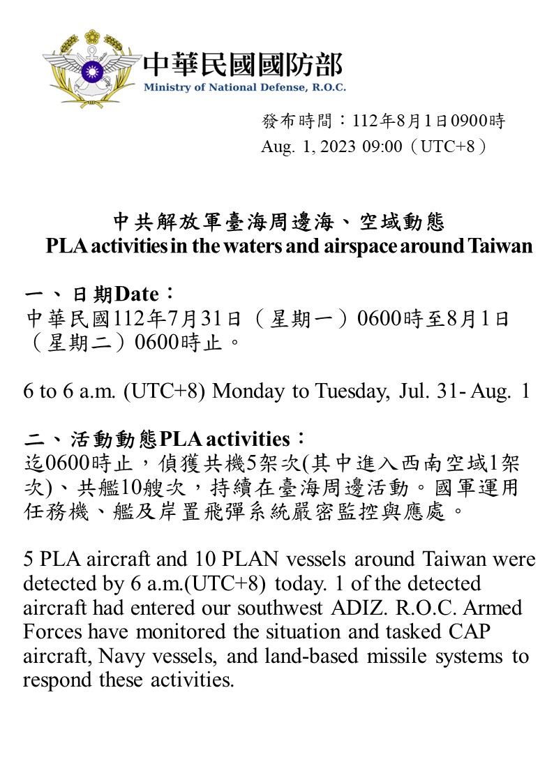 迄0600時止,偵獲共機5架次(其中進入西南空域1架次)、共艦10艘次,持續在臺海周邊活動。國軍運用任務機、艦及岸置飛彈系統嚴密監控與應處。