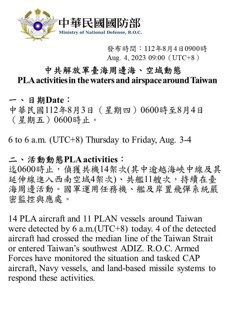 迄0600時止,偵獲共機14架次(其中逾越海峽中線及其延伸線進入西南空域4架次)、共艦11艘次,持續在臺海周邊活動。國軍運用任務機、艦及岸置飛彈系統嚴密監控與應處。