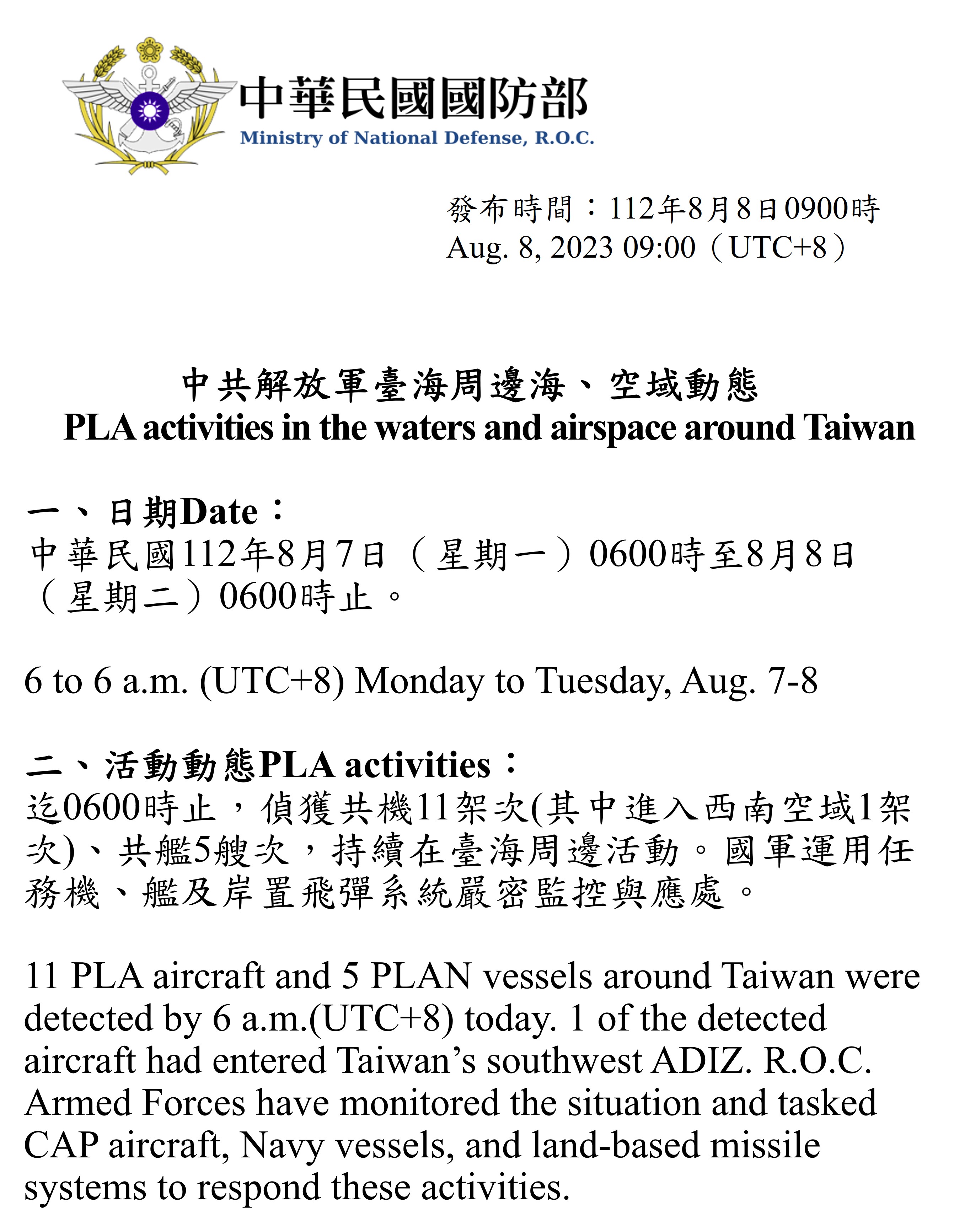 迄0600時止,偵獲共機11架次(其中進入西南空域1架次)、共艦5艘次,持續在臺海周邊活動。國軍運用任務機、艦及岸置飛彈系統嚴密監控與應處。