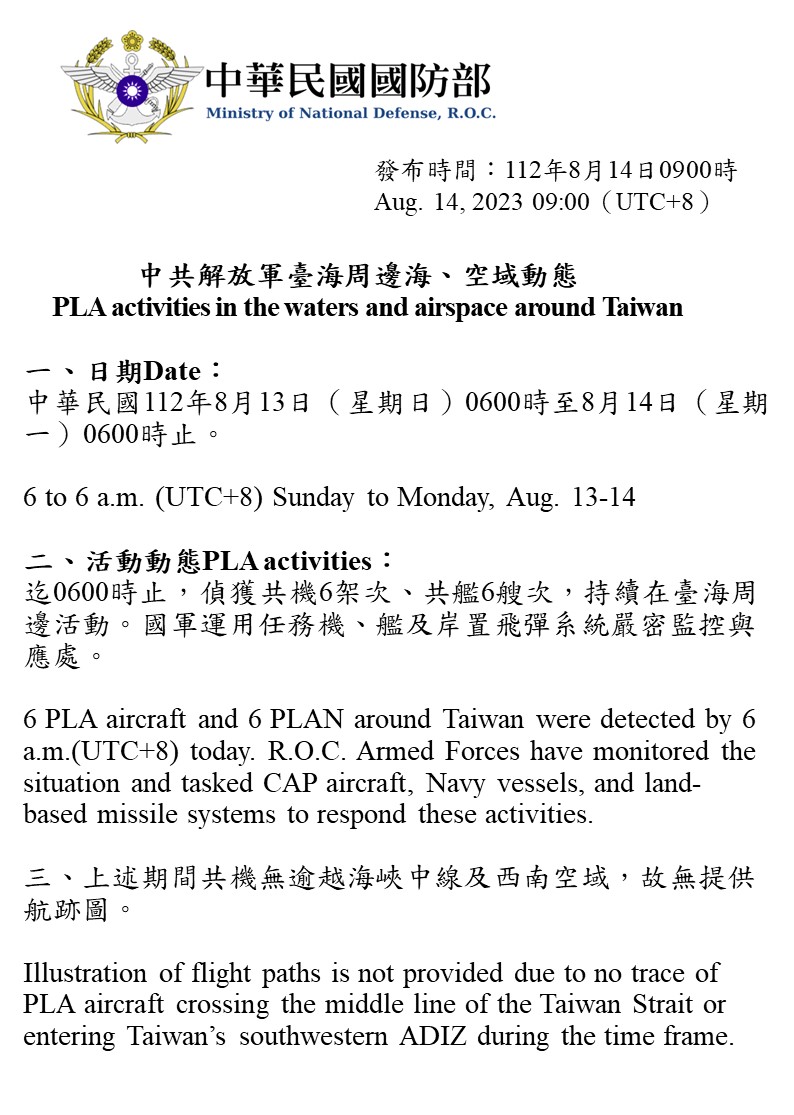 迄0600時止,偵獲共機6架次、共艦6艘次,持續在臺海周邊活動。國軍運用任務機、艦及岸置飛彈系統嚴密監控與應處。