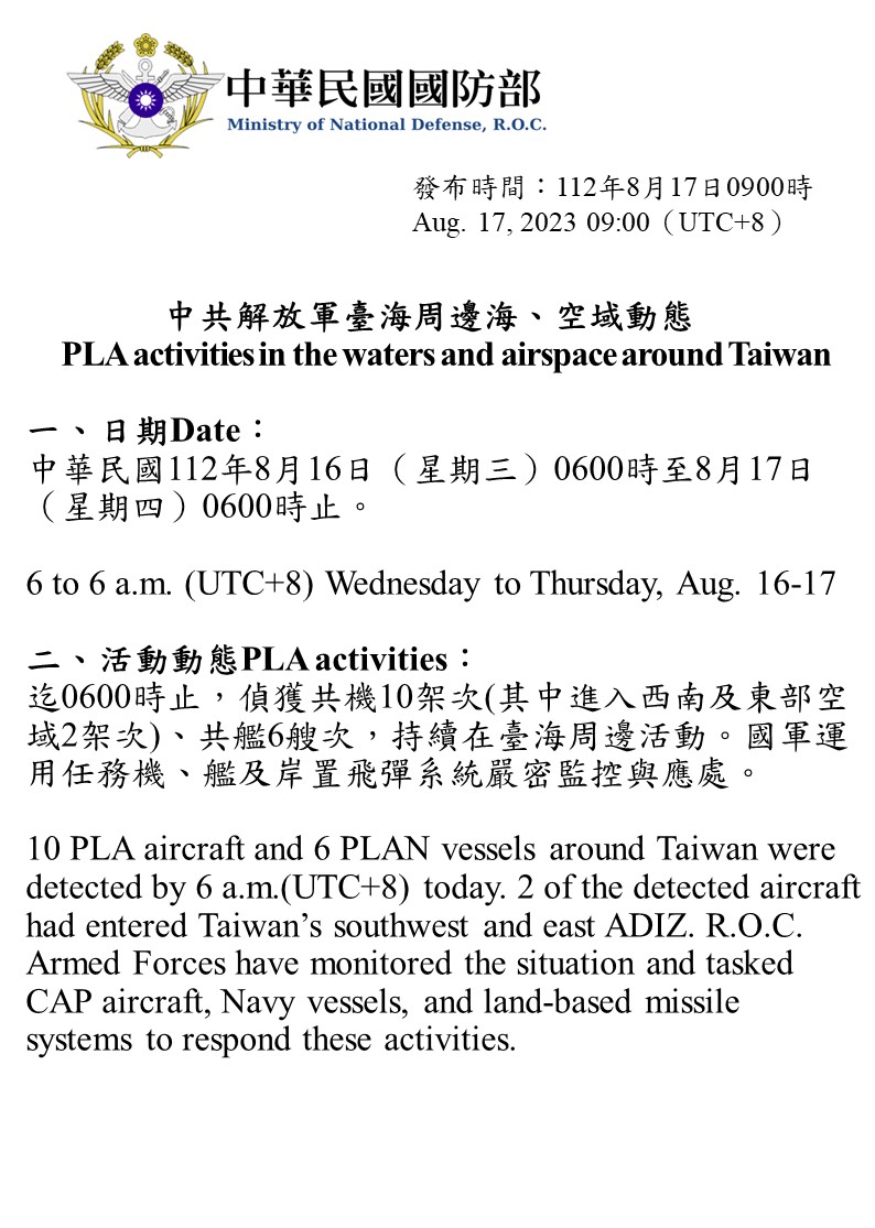 迄0600時止,偵獲共機10架次(其中進入西南及東部空域2架次)、共艦6艘次,持續在臺海周邊活動。國軍運用任務機、艦及岸置飛彈系統嚴密監控與應處。