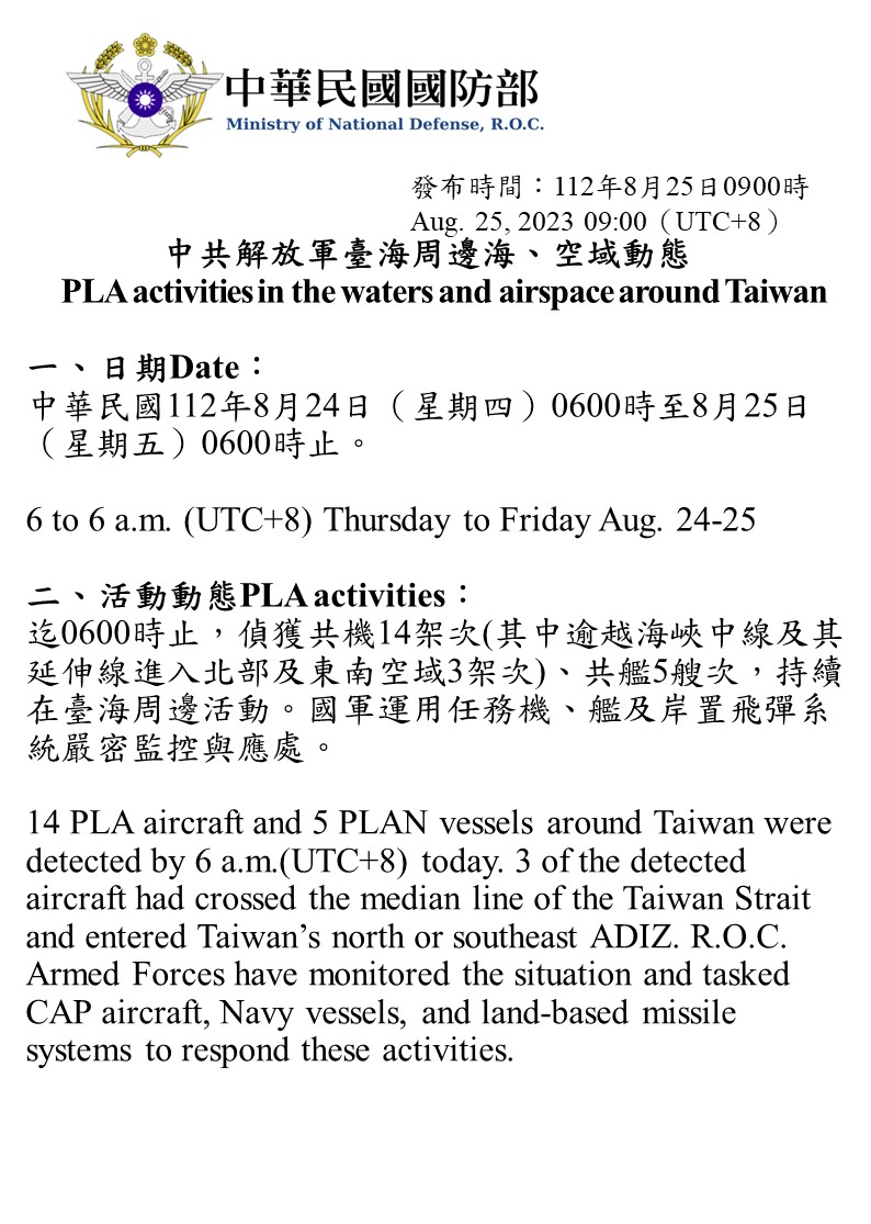 迄0600時止,偵獲共機14架次(其中逾越海峽中線及其延伸線進入北部及東南空域3架次)、共艦5艘次,持續在臺海周邊活動。國軍運用任務機、艦及岸置飛彈系統嚴密監控與應處。