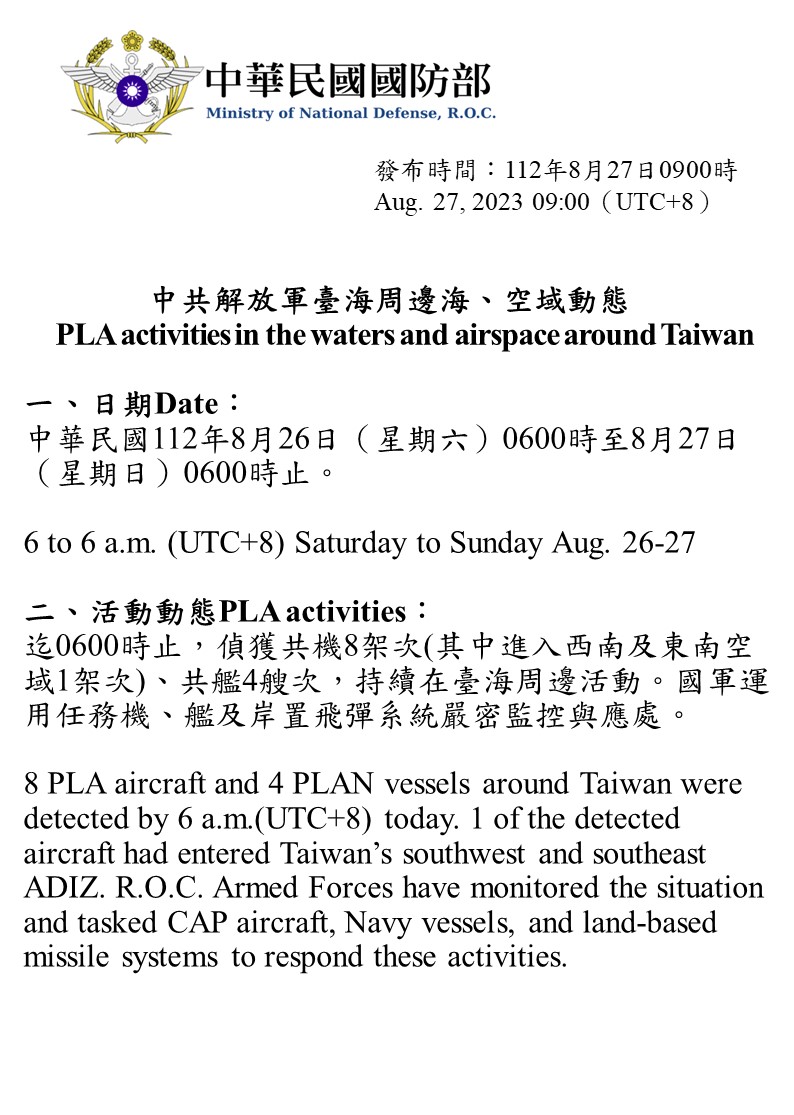 迄0600時止,偵獲共機8架次(其中進入西南及東南空域1架次)、共艦4艘次,持續在臺海周邊活動。國軍運用任務機、艦及岸置飛彈系統嚴密監控與應處。