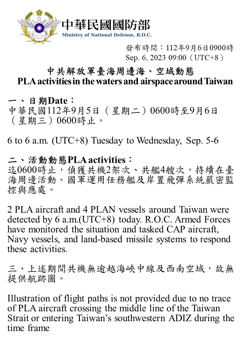 迄0600時止,偵獲共機2架次、共艦4艘次,持續在臺海周邊活動。國軍運用任務艦及岸置飛彈系統嚴密監控與應處。
