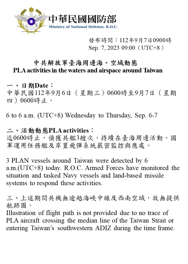 迄0600時止,偵獲共艦3艘次,持續在臺海周邊活動。國軍運用任務艦及岸置飛彈系統嚴密監控與應處。