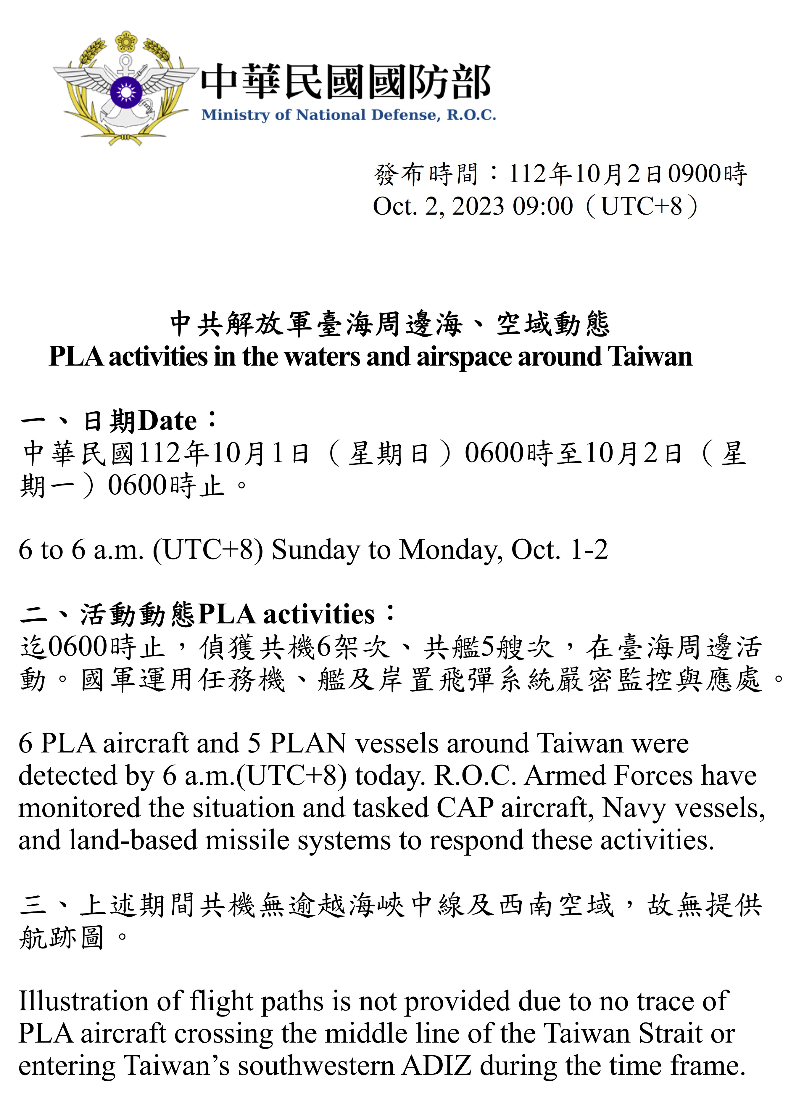 迄0600時止,偵獲共機6架次、共艦5艘次,在臺海周邊活動。國軍運用任務機、艦及岸置飛彈系統嚴密監控與應處。